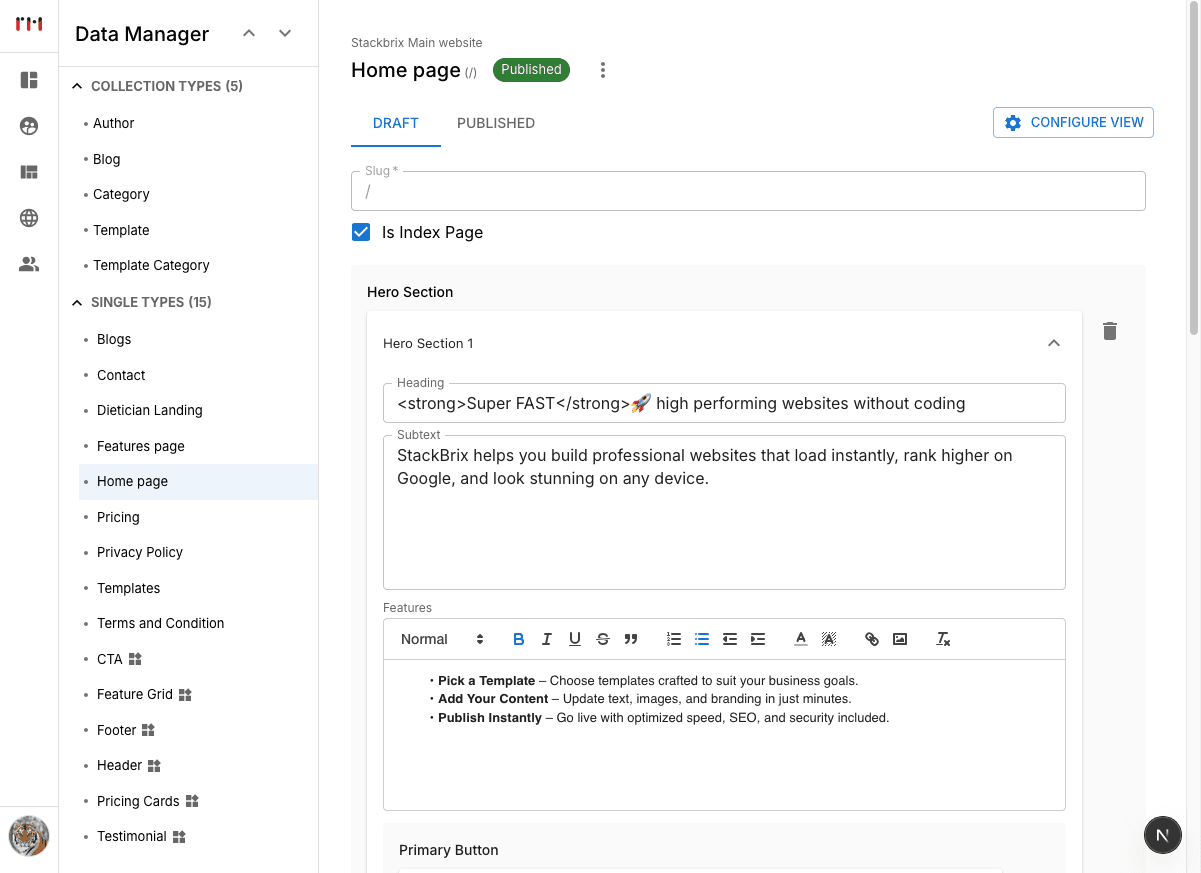 Effortlessly stage, review, and publish your website with a few clicks, keeping content live only when ready.